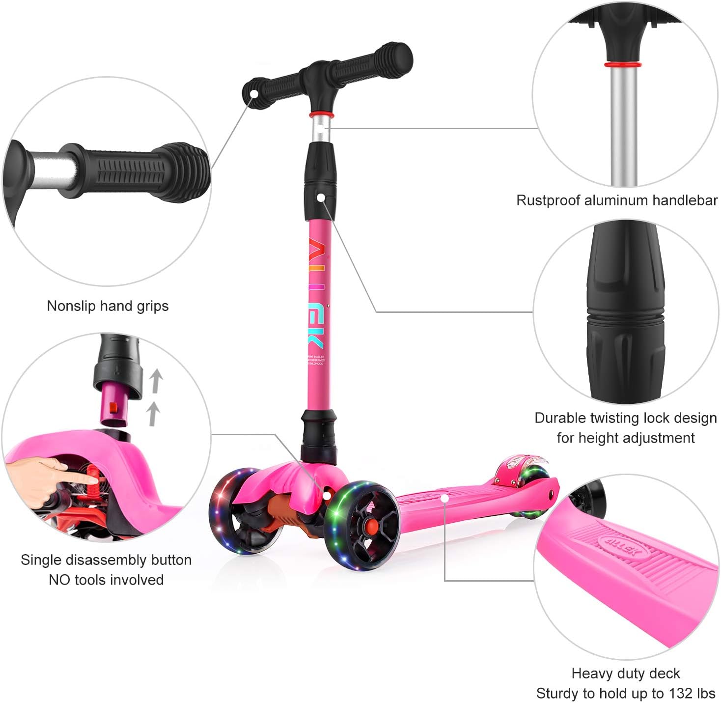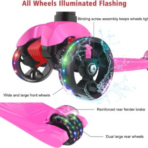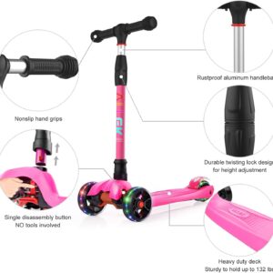 Allek Kick Scooter B02, Lean ‘N Glide Scooter with Extra Wide PU Light-Up Wheels and 4 Adjustable Heights for Children from 3-12yrs (Rose Pink)
