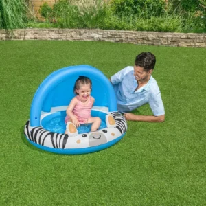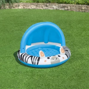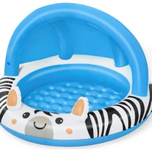 Product Size: 97 cm x 66 cm (38 in. X 26 in. ) Perfect for kids ages 2+ Friendly zebra graphics Inflatable UV Careful sunshade provides safe, shaded fun in the sun Soft, inflatable floor provides added comfort Water Capacity: 26 L (7 gal. ) Contents: 1 pool, repair patch.