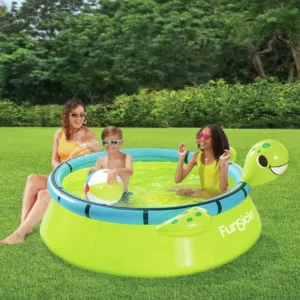 The Funsicle Happy Turtle QuickSet Pool brings excitement to young swimmers with an adorable character design and built-in water sprayer. Setting up this inflatable pool is simple and quick. Just inflate the top ring and watch as the pool rises as it fills with water. It is durably made from 3-ply puncture-resistant materials. The Happy Turtle QuickSet Pool is ideal for playdates, with space for 3 swimmers.