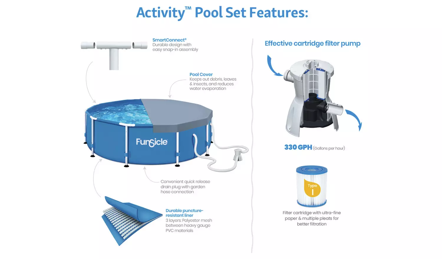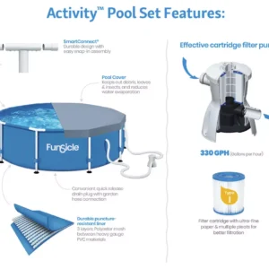 The Funsicle 10ft (3.05 m) Activity Pool includes all the essentials for outdoor play and swim. With enough space for 5 people, you can delight in swimming and relaxing. The snap-in pole assembly makes setup simple, while the strong metal frame and puncture-resistant liner can withstand active play all summer. The 10ft Activity Pool comes with an effective cartridge filter pump, ensuring cleaner water for sparkling swims. A sturdy pool cover is also included, keeping the water debris-free when not in use.