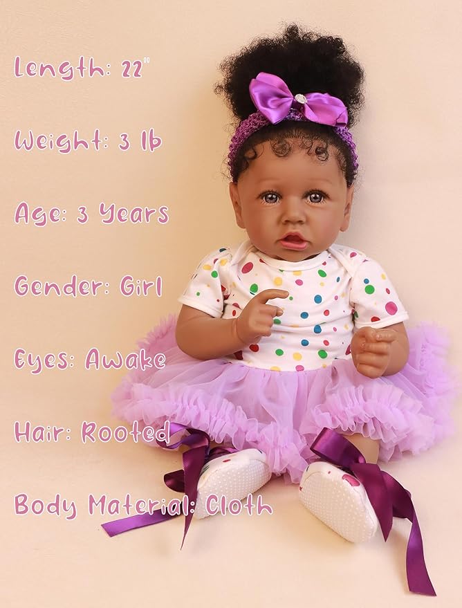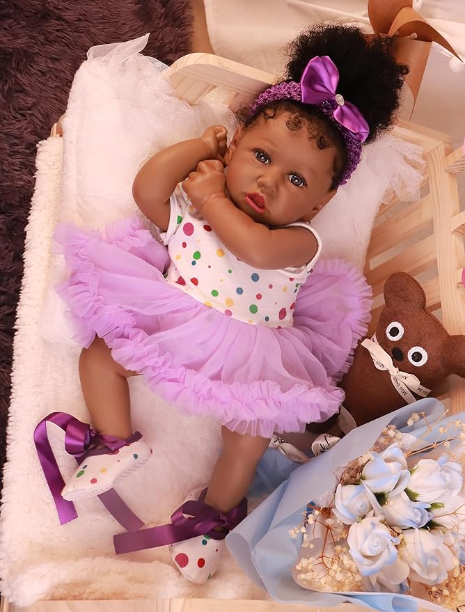 Experience the magic of nurturing play with this stunningly lifelike reborn doll, meticulously crafted to resemble a sleeping African American baby girl. Perfect for collectors, aspiring caregivers, or sensory play, this 22.8-inch soft-bodied doll features hand-painted details, weighted limbs, and premium accessories for an immersive experience.