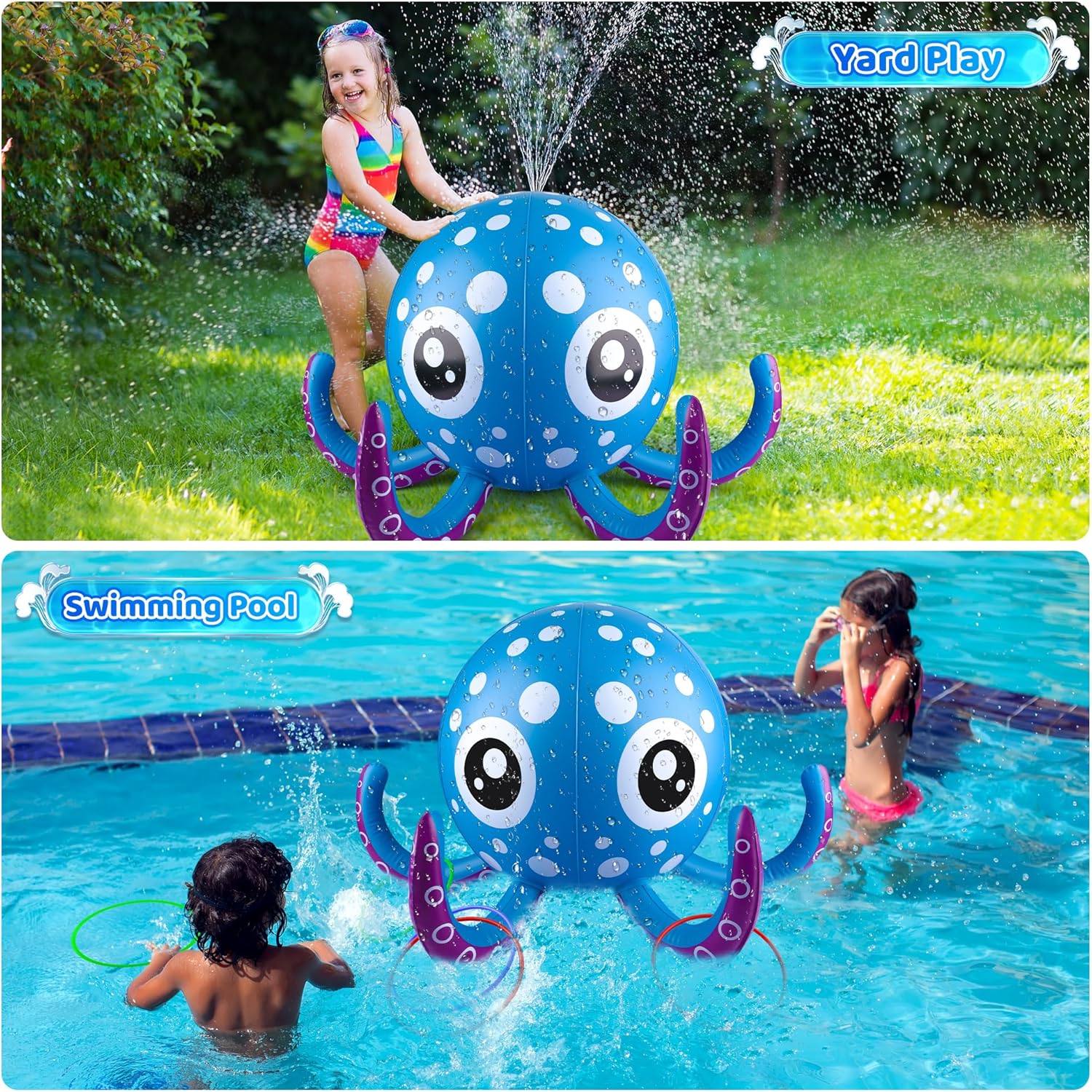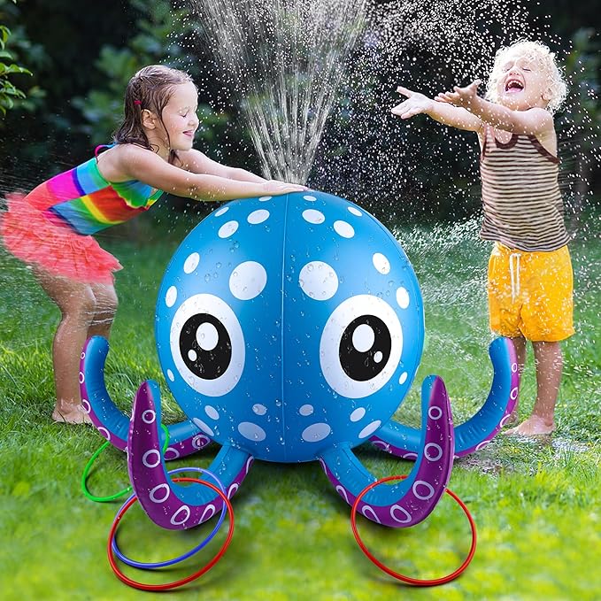 Dive into summer fun with this adorable inflatable octopus sprinkler, designed for endless backyard water play! Perfect for kids ages 3-6+, this cheerful octopus sprays water from its tentacles while kids toss 6 colorful floating rings onto its arms for a fun, interactive challenge.