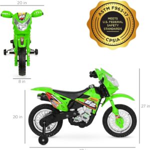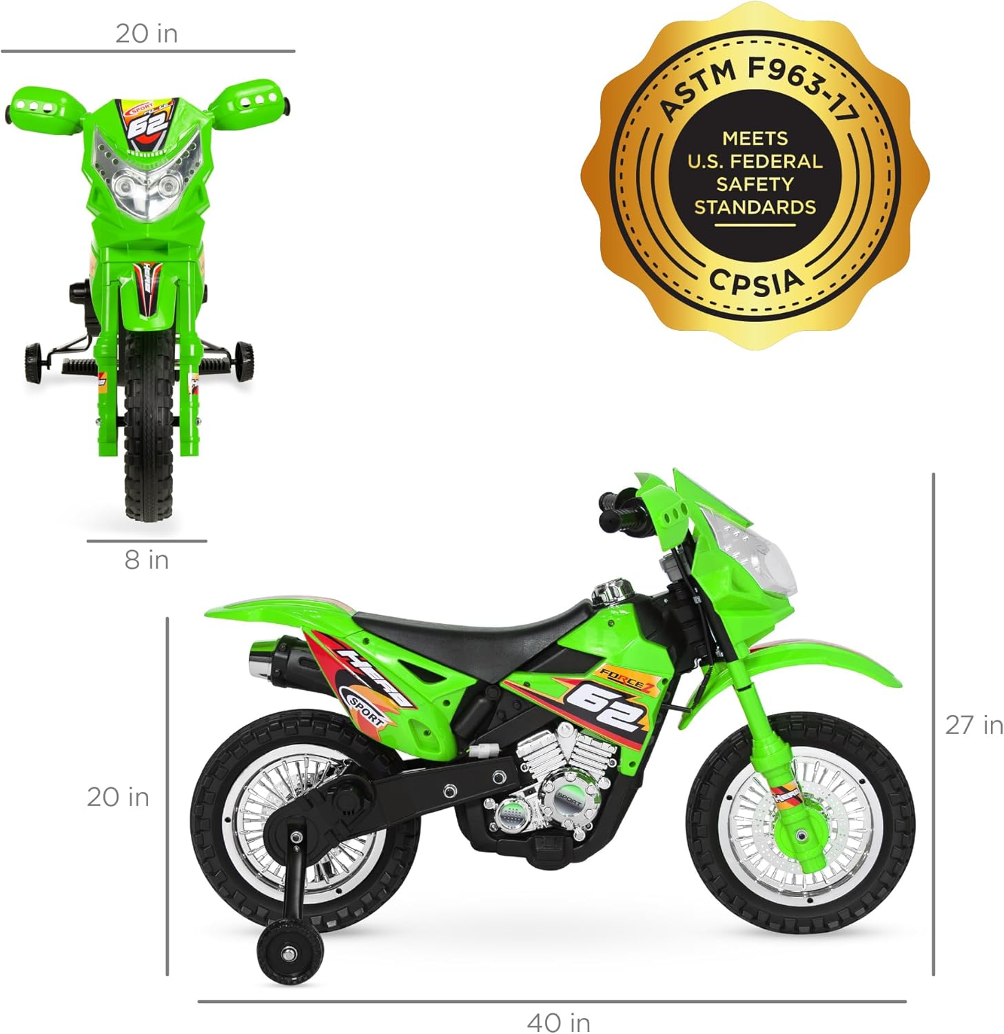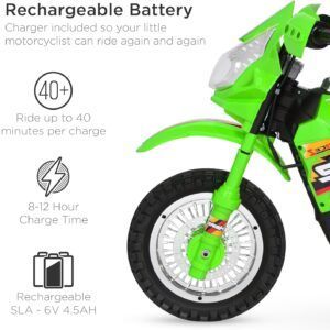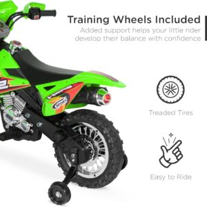 Kids 6V Ride On Motorcycle w/Treaded Tires, Working Headlights, 2mph Top Speed, Training Wheels, Realistic Sounds, Music, Battery Charger – Green