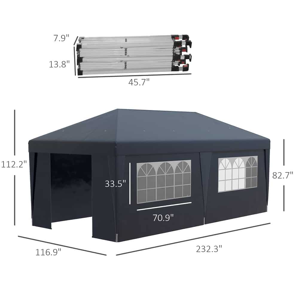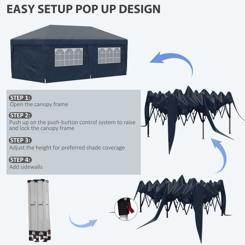 The ultimate all-in-one outdoor shelter!Β TheΒ Outsunny 19′ x 10′ Pop Up CanopyΒ comes complete withΒ 4 sidewalls, leg weight bags, and height adjustabilityΒ β perfect forΒ parties, markets, tailgates, and outdoor events. WithΒ durable weather protection and quick setup, this tent keeps you covered in style.