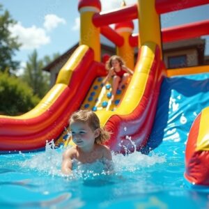 Transform your backyard into a water park with this Vibrant Inflatable Water Slide! Perfect for summer fun, this inflatable set features multiple slides that lead into a refreshing pool, making it an ideal choice for kids and family gatherings.